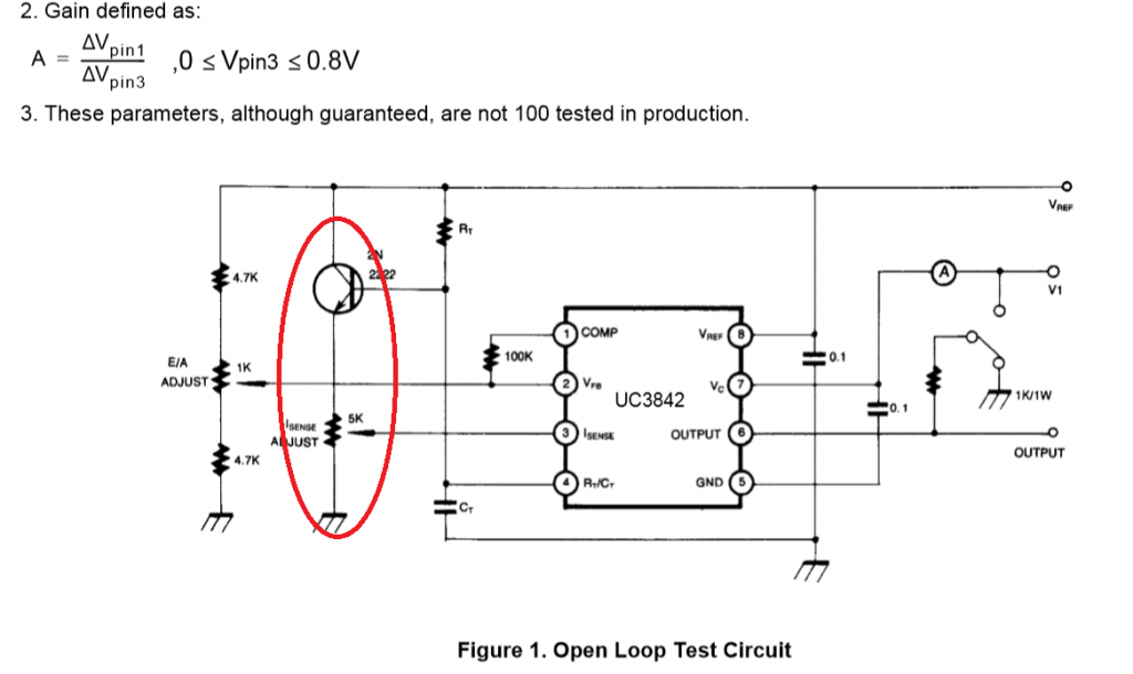 Vì thế khi ráp mạch test IC này theo sơ đồ đính kèm không thể bỏ con 2N2222 và nối GND chân 3. tình huống này UC384x sẽ bất khả dụng (chân 6 không có xung ra dù chân 4 có xung tam giác).