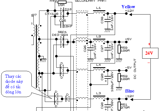 ... bác chọn lấy hai dây vàng +12V (yellow) và dây xanh dương -12V (Blue) làm nguồn ra thì bác đã có 24V roài... tuy nhiên, đường -12V tải dòng nó nhỏ lắm (dưới 1A), níu cần tải dòng lớn hơn bác thay Diode nắn dòng của đường -12V lên theo y/c là Ok...Nguyên văn bởi k300 Xem bài viếtcảm ơn bác đã chỉ giáo