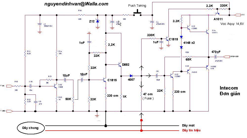 Mình có một hệ thống đàm thoại kiểu Intercom được sử dụng trong các hầm lò khai thác. Nguyên tắc hoạt động thì rất đơn giản. Khi công nhân nói vào MIC của một máy thì tín hiệu sau tầng tiền khuếch đại sẽ được truyền lên dây và vào tầng khuếch đại công suất của các máy khác, đảm bảo tất cả các máy khác đều nghe được.
