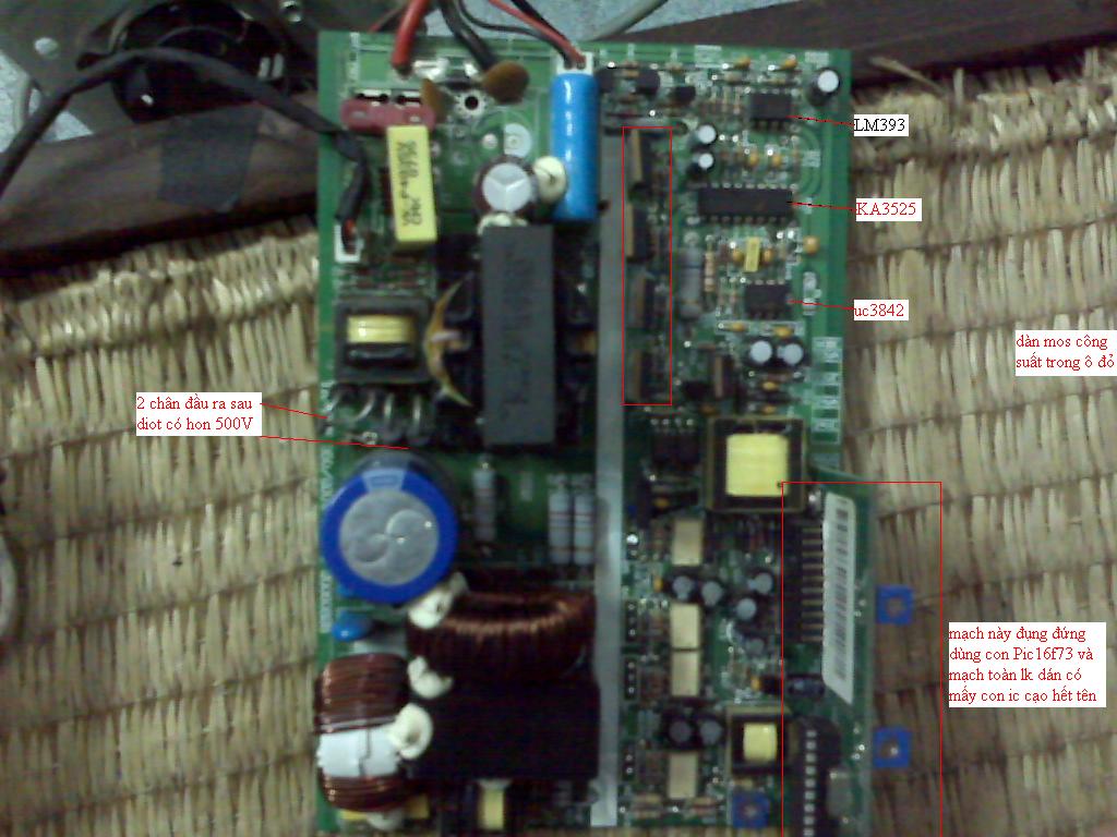 nó dùng 1 con ka3525a để dao động điều khiển dàn mos công suất.1 con uc3842 để dao động cấp nguồn cho 1 mạch chạy con pic16f73 (con này là gì e chưa rõ) và 1 con lm393 con này chắc hồi tiếp.e rút chân diot lên đo 1 chiều ở 2 chân con diot cầu đc hơn 500V.