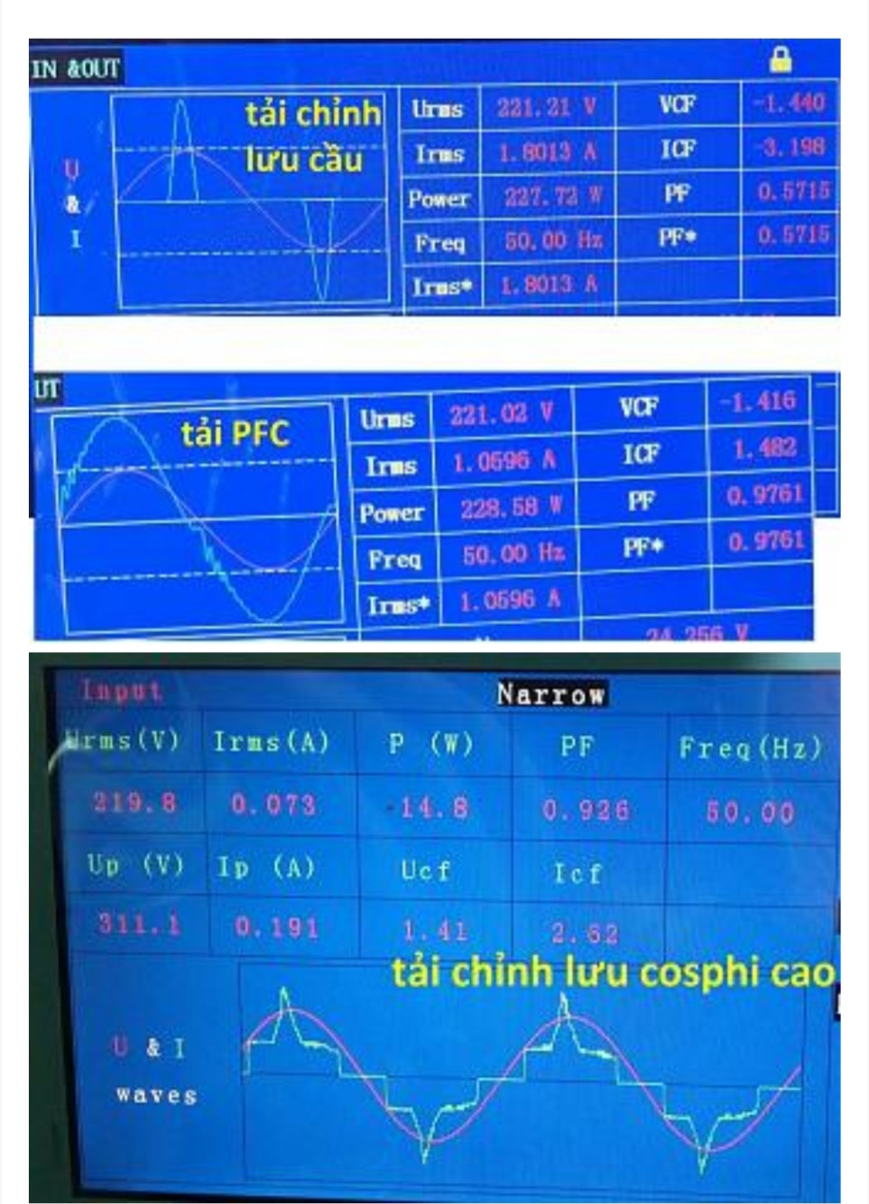 Hình số 3 bạn để thang đo dòng nhỏ nên thấy gai lớn. Nếu để cùng thang đo như hình 1 thì sẽ thấy xung dòng điện rộng và thấp hơn nhiều. PF là 0,92 chứ đâu phải 0,98.sau.ph