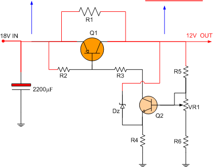 Nguyên lý hoạt động: Giả sử : Khi điện áp vào tăng => điện áp ra tăng => điện áp chân E đèn Q2 tăng nhiều hơn chân B ( do có Dz gim từ chân E đèn Q2 lên Ura, còn Ulm chỉ lấy một phần Ura ) do đó UBE giảm => đèn Q2 dẫn giảm => đèn Q1 dẫn giảm => điện áp ra giảm xuống.