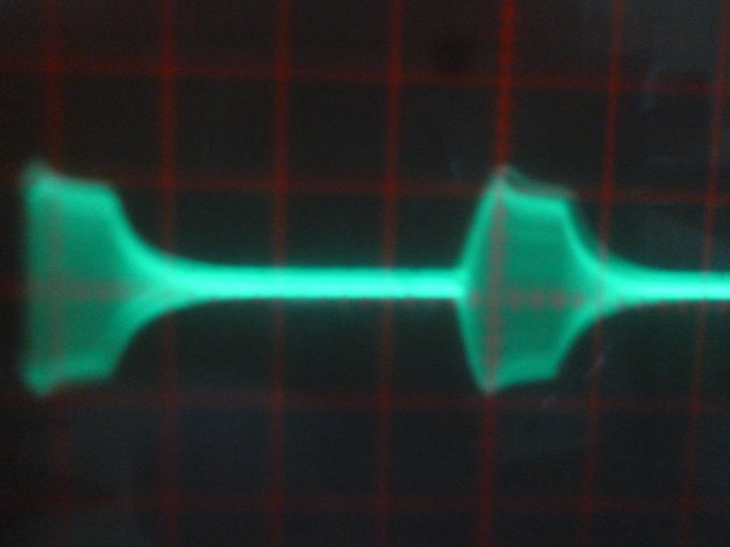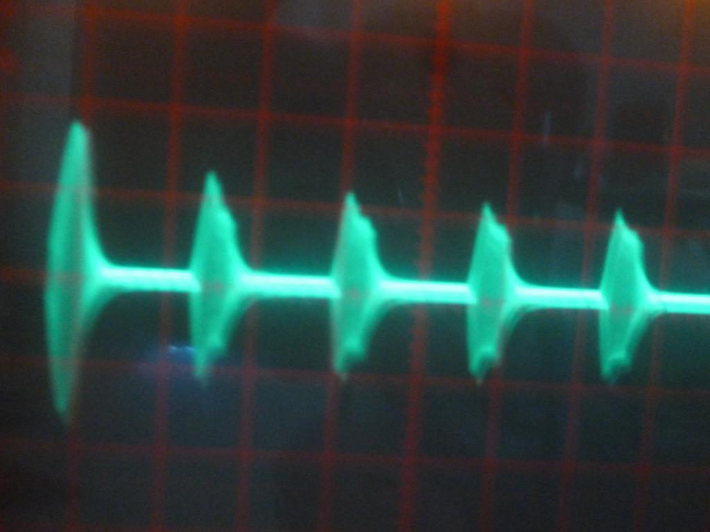 Thứ sóng mà tôi thu được có hình dạng lý tưởng ở 100µS đầu tiên nhưng sau đó là sóng có biên độ nhỏ và đều đều nhàm chán. Mất đến hàng tuần đến nay sau khi làm bộ ngắt hiện đại hơn IC 555 mà dùng vi xử lý để sóng ra có thể bào chế dài ngắn hửu hiện hơn tôi đã tìm ra được hình ảnh cần tìm, hình 4 là cộng hưởng chưa tối ưu hóa ( mổi chùm sóng dài 200 µS ngắt quảng 600 µS duty khoản 25%)