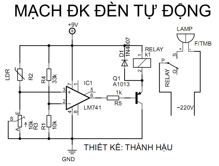 Nguyên lý:-Khi ánh sáng chiếu vào quang trở-->điện trở giảm-->chân (+)>chân(-)-->ngõ ra op-amp sấp sỉ bằng Vcc-->transistor PNP ở chế độ khóa -->Relay ngắt(ko hoạt động)-->đèn LAMP tắt.Và ngược lại.