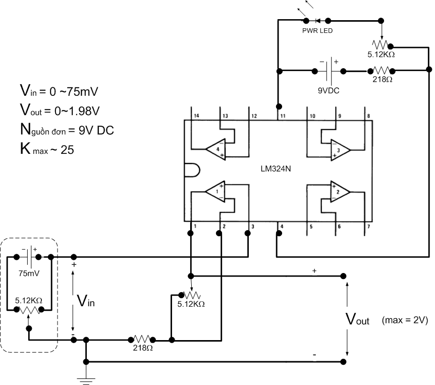 Vấn đề là trên chương trình mô phỏng (Elec. Workbench Edu. Ver 5.12) thì mạch hoạt động/đáp ứng tốt với các thay đổi giá trị của các biến trở. Nhưng khi lắp mạch thực tế bên ngoài thì nó hoàn toàn không hoạt động (giá trị Vout luôn là 0.000V).