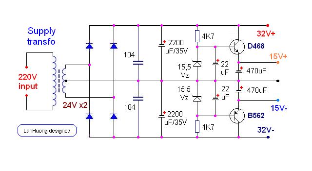 - Mạch dùng zenner 15,5V (hay 15Vz cũng được) ghim áp và BJT khuếch đại dòng, tối đa có thể đến 500 mA. Điểm giữa biến áp 0V cũng là điểm masse chung.