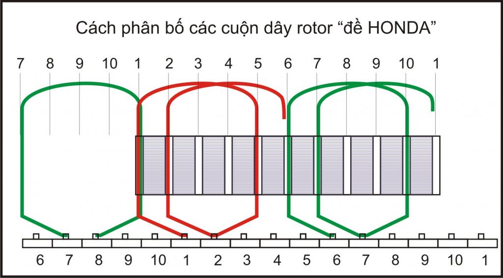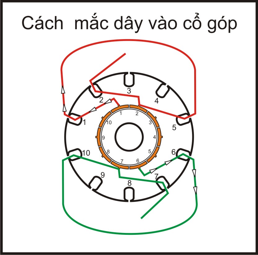* Rotor có 10 rảnh quấn dây. Cổ góp có 10 lam, (số rảnh bằng số lam). Bước quấn từ 1 đến 5. nối dây vào 2 lam cổ góp ngay giửa tâm cuộn dây quấn. (lam đồng có móc để mắc dây mà không cần hàn chì).