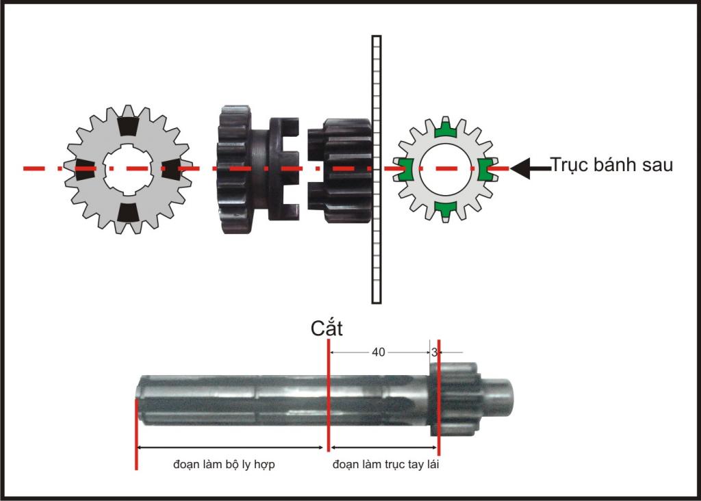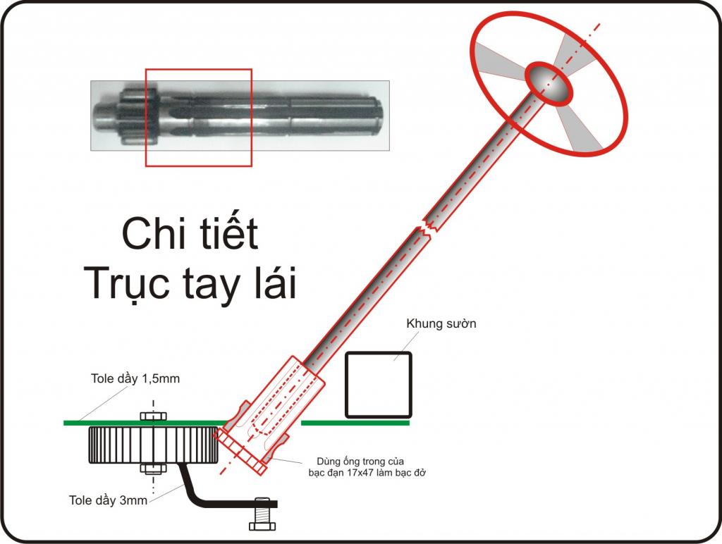 Vì những phân tích trên, nên tôi thích thiết kế tay lái vô-lăng có nhông truyền, tuy hơi khó tí xíu nhưng giá thành rẻ, dùng 02 nhông (nhông cốt số và nhông số 3) của Honda củ, rất dể tìm.