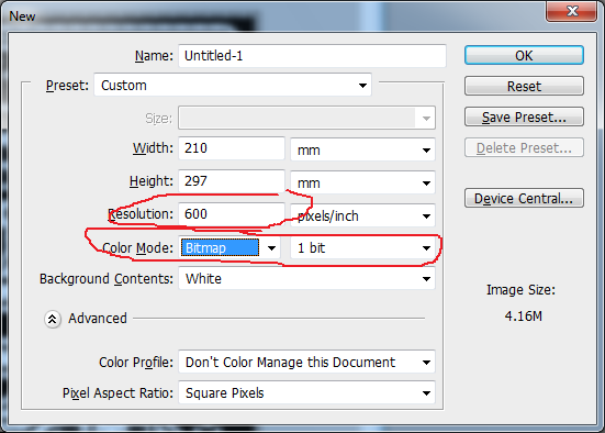 3 - Files --> New --> chọn preset: international, size: A4, resoluttion: 600, color mode: bitmap 1bit, như hình: