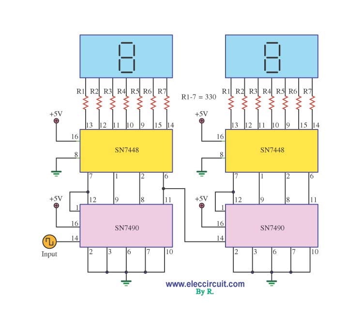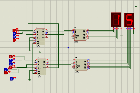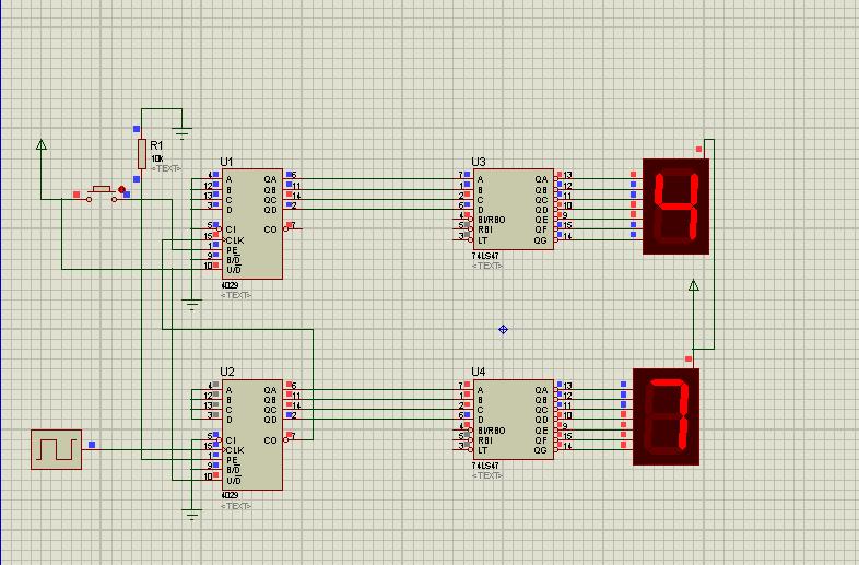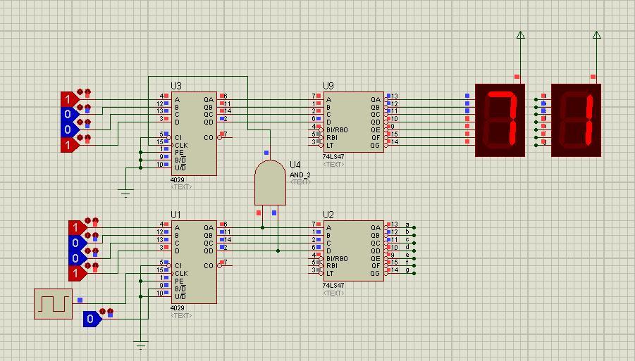 Khi có xung tin hiệu vào chân 15 của IC 4029, nó sẽ cho ra một tín hiệu nhị phân, Nó sẽ gửi tín hiệu từ chân Q0 đến Q3, và các pin 6,11,14 và 2 của IC 4029, đến đầu vào của IC 4513. Đây là vi mạch hiển thị bởi các tín hiệu giải mã nhị phân tới led 7 đoạn, sẽ được hiển thị từ 0 đến 9