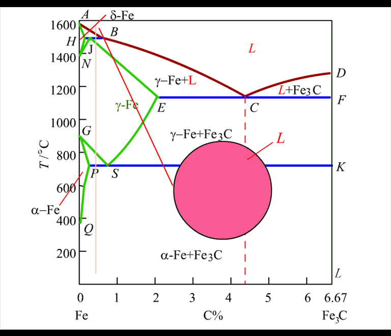 Trong đó, Giản đồ trạng thái Fe- Fe3C của hệ hợp kim Fe-C đã cho được biểu diễn trên trục tung là nhiệt độ oC và trục hoành là thành phần các bon %C thay đổi trong Fe đến phạm vi tối đa là Cmax=6.67%, tại đây C tác dụng hóa học với Fe để tạo thành hợp chất hóa học Fe3C đồng thời cần hiểu: tại điểm 0%C có 100%Fe được kí hiệu Fe, tại 6.67% C có 100% Fe3C được kí hiệu là Fe3C.