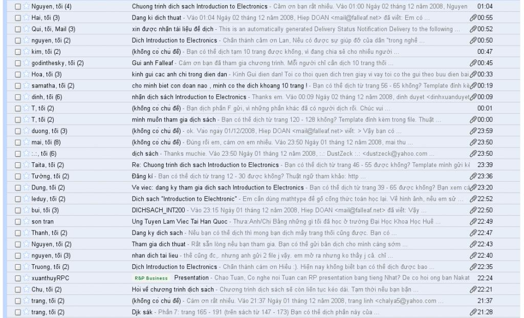 Không thể ngờ được là chỉ trong vòng mấy phút, F trả lời cho từng thành viên để thể hiện diễn đàn trân trọng sự đóng góp của các bạn ấy. Thế mà nhìn cái Inbox cứ chưa kịp trả lời xong một người thì lại có một email mới tới... tham gia chương trình dịch sách.