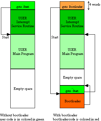 Về nguyên tắc thì hoạt động của bootloader các dòng vi điều khiển khá giống nhau .Hình sau mô tả sự liên quan hoạt của bootloader với chương trình chính. Đối với AVR thì bootloader có thể sử dụng từ 256 -> 4096 byte đoạn cuối flash, sau khi nạp chương trình bootloader vào AVR bạn phải config phần fuse bit sao cho block bootloader AVR được tách biệt với phần chương trình chính