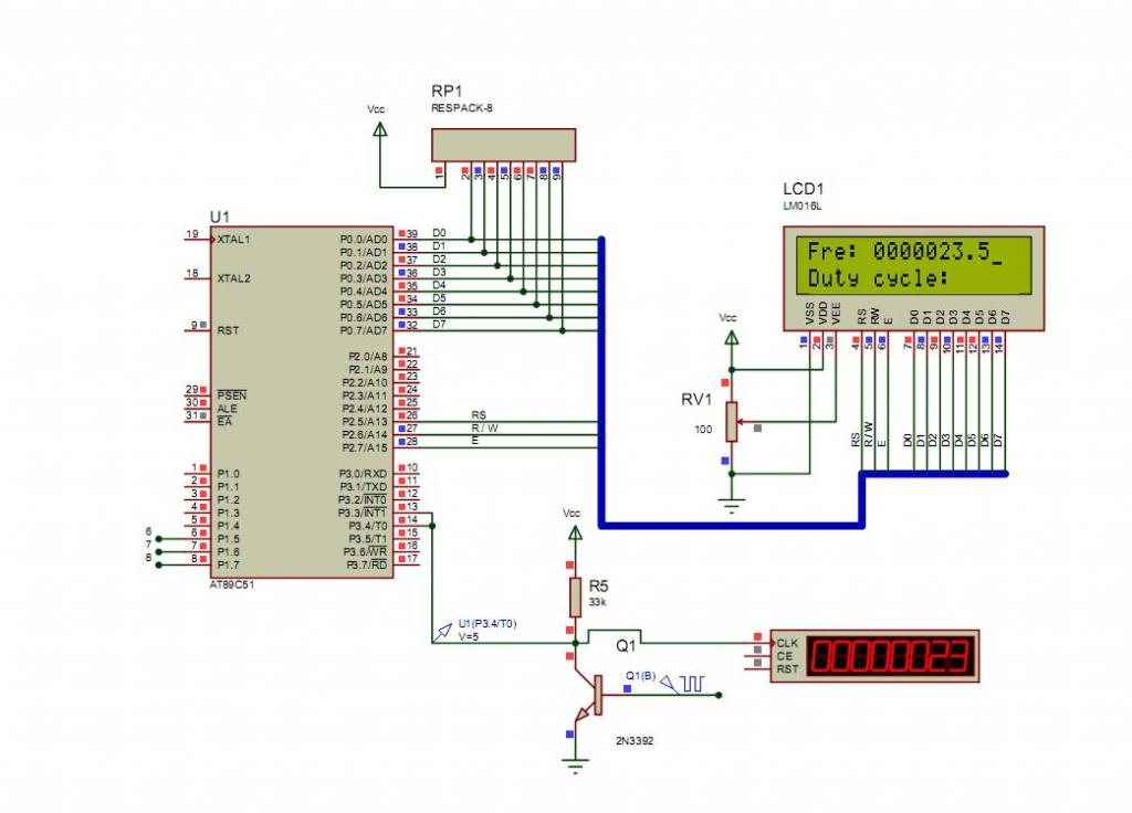em mới làm 1 mạch đo tần số như thế này (đây chỉ là mạch mô phỏng, mạch thật sẽ làm đầy đủ mạch reset, thạch anh, nối chân EA....)