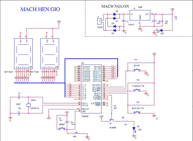 Code này em tìm được là dùng 89c51 để hẹn giờ. Nguyên lý hoạt động của mạch là khi có nhấn nút ở nút nhấn p3.3 thì bộ đếm ở led tăng lên 1 ,nhấn nút giảm ở chân p3.4 thì bộ đếm giảm 1.khi nhấn nút Start ở p3.2 thì bộ đếm bắt đầu đếm ngược cho đến khi = 0 thì đưa ra tín hiệu ở chân p3.5 làm led sáng