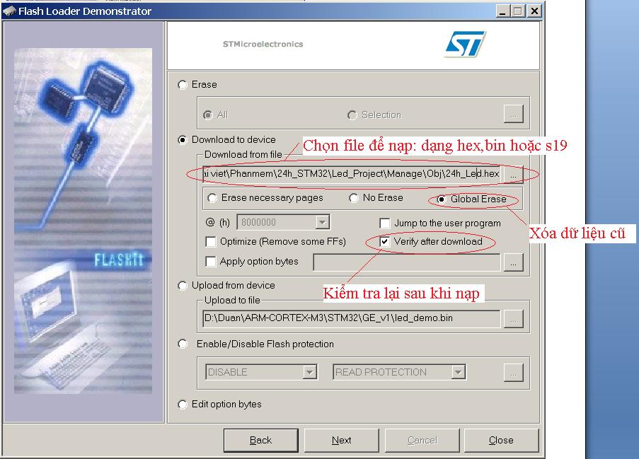 * Lưu ý: chọn “Global Erase” để chắc rằng dữ liệu cũ sẽ bị xóa, flash sẵn sàng cho dữ liệu mới. Chọn “Verify after download” để kiểm tra dữ liệu sau khi nạp có đúng hay không.