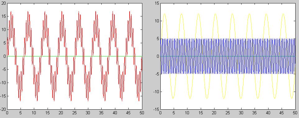 Một tính hiệu sin biên độ 5v - tấn số gấp 10 lần (màu xanh)