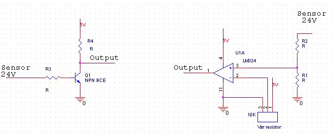 MÌnh đang làm mạch dùng VDK nhận tín hiệu từ con cảm biến quang 24V. Đầu ra con cảm biến quang là dạng ON/OFF, điện áp ra cũng là 24V mà VDK chỉ nhận tín hiệu là 5V. Mình đã làm như sau, lấy tín hiệu của sensor(24V)cho qua con transistor C282 và lấy đầu ra 5V cho vào con VDK==> cách này chạy ok (như hình vẽ). Tuy nhiên mình muốn làm theo cách khác là từ tín hiêu 24V cho phân áp thành 5V,tín hiệu 5V này cho qua mạch so sánh (dùng con LM324)đầu ra của mạch so sánh này cho vào VDK. Cách mắc như trên hình vẽ, mình học lý thuyết là như vậy(V+ > V- thì Vout=Vs+ và ngược lại) tuy nhiên sao khi mắc thực tế đúng như trên thì mạch ko chạy. bác nào đã làm qua mạch so sánh thì chỉ giúp mình với.