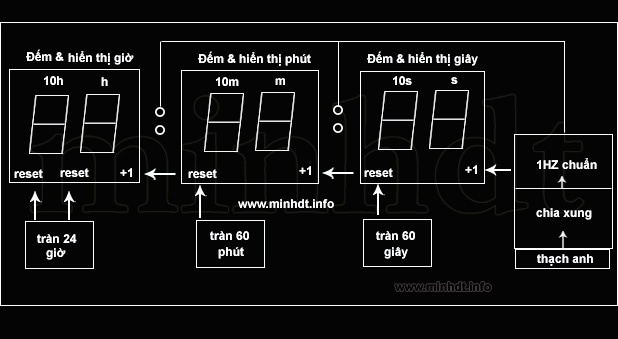 Đồng hồ sẽ hiển thị giờ phút giây, MCU sẽ đọc xung chuẩn 1 HZ để xử lý thời gian; có thể điều chỉnh được thời gian ( dùng 3 phím : select, up, down); để đảm bảo mạch ko bị reset khi mất điện thì em sẽ dùng pin và rele để chuyển qua nguồn dự phòng; phần hiển thị có thể dùng LED 7 đoạn hoặc có thể mở rộng hiển thị trên LED matrix càng tốt. Em thì chưa nắm một số thuật toán để lập trình, em chỉ hình dung được quá trình tràn của đồng hồ như trong hình sau thôi: