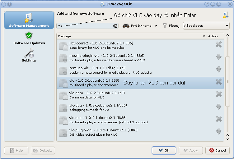 VLC có sẵn trong kho phần mềm Ubuntu, cài đặt dễ dàng thông qua giao diện KPackageKit