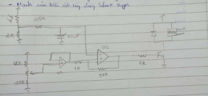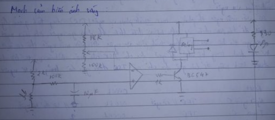 - Quang trở các bạn mua trên lazada, loại 5mm. Khi ánh sáng bên ngoài thay đổi -> R cảm biến thay đổi -> điện áp tại ngõ vào không đảo của opamp thay đổi.