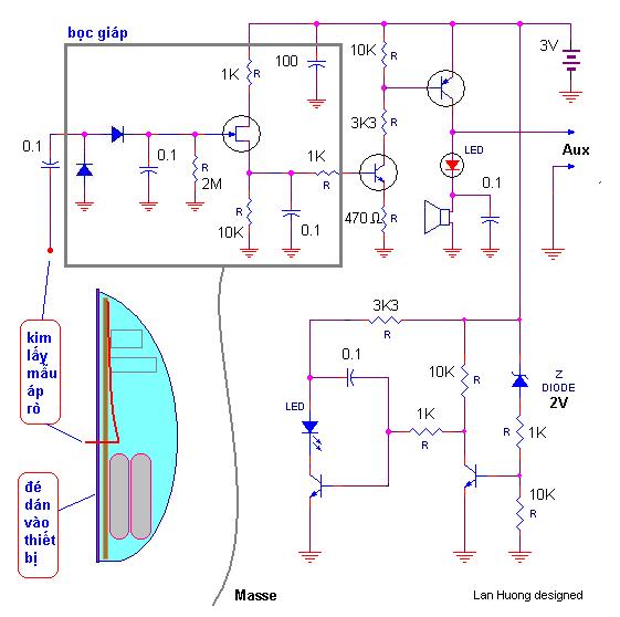 Đầu vào của mạch là một kim sắc, xuyên từ bo mạch xuống đáy vỏ chuột quang, điện áp rò nếu có sẽ được nắn nhân đôi điện áp đưa vào gate transistor trường. Dòng ra sẽ được hệ darlington khuếch đại và hiển thị bằng Led đỏ và còi chỉ báo. Điện áp chỉ báo được đưa ra mạch Aux (Auxiliary) để được xử lý tiếp ở một bộ phận khác (cúp điện, báo động v.v...).